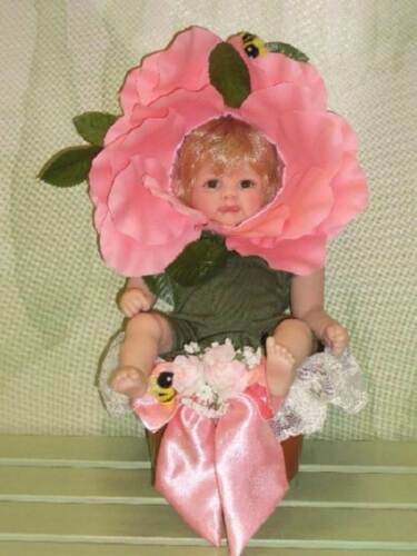 Blümchen trägt einen dunkelgrünen Blütenanzug und die Mütze ist wie eine Rose gearbeitet. Man kann das Kostüm auch ausziehen.